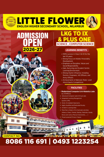 Little Flower English Higher Secondary School is a premier institution in Nilambur, since 1978 functioning under the Little Flower Educational and Charitable Trust. This ISO Certified school provides nurturing and disciplined environment that promotes academic excellence, character formation, and holistic development.